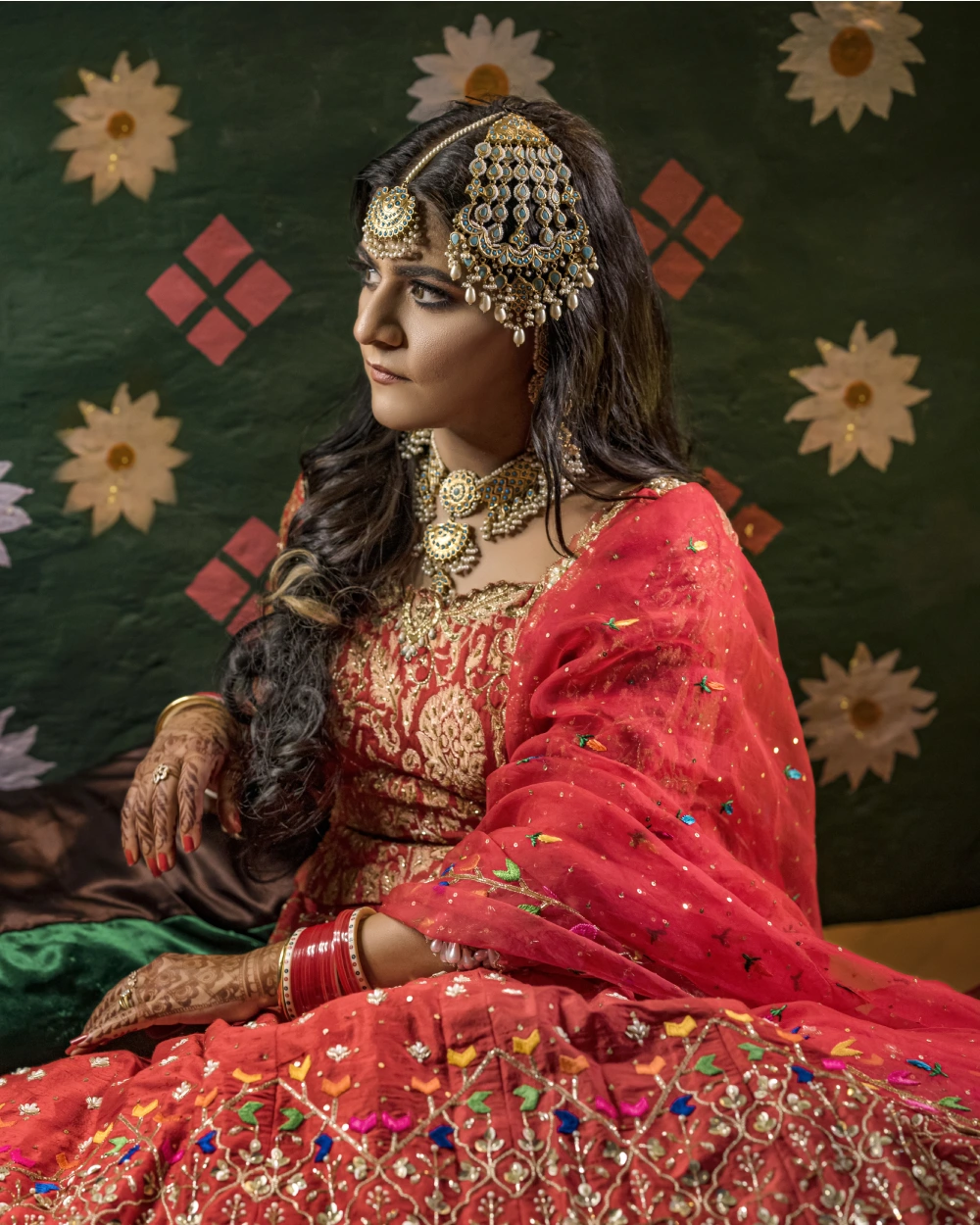 Red khadi silk lehnga with phulkari work paired along dabka motifs is such a perfect fusion of modern and traditional feel. The phulkari dupatta is a beauty in itself.