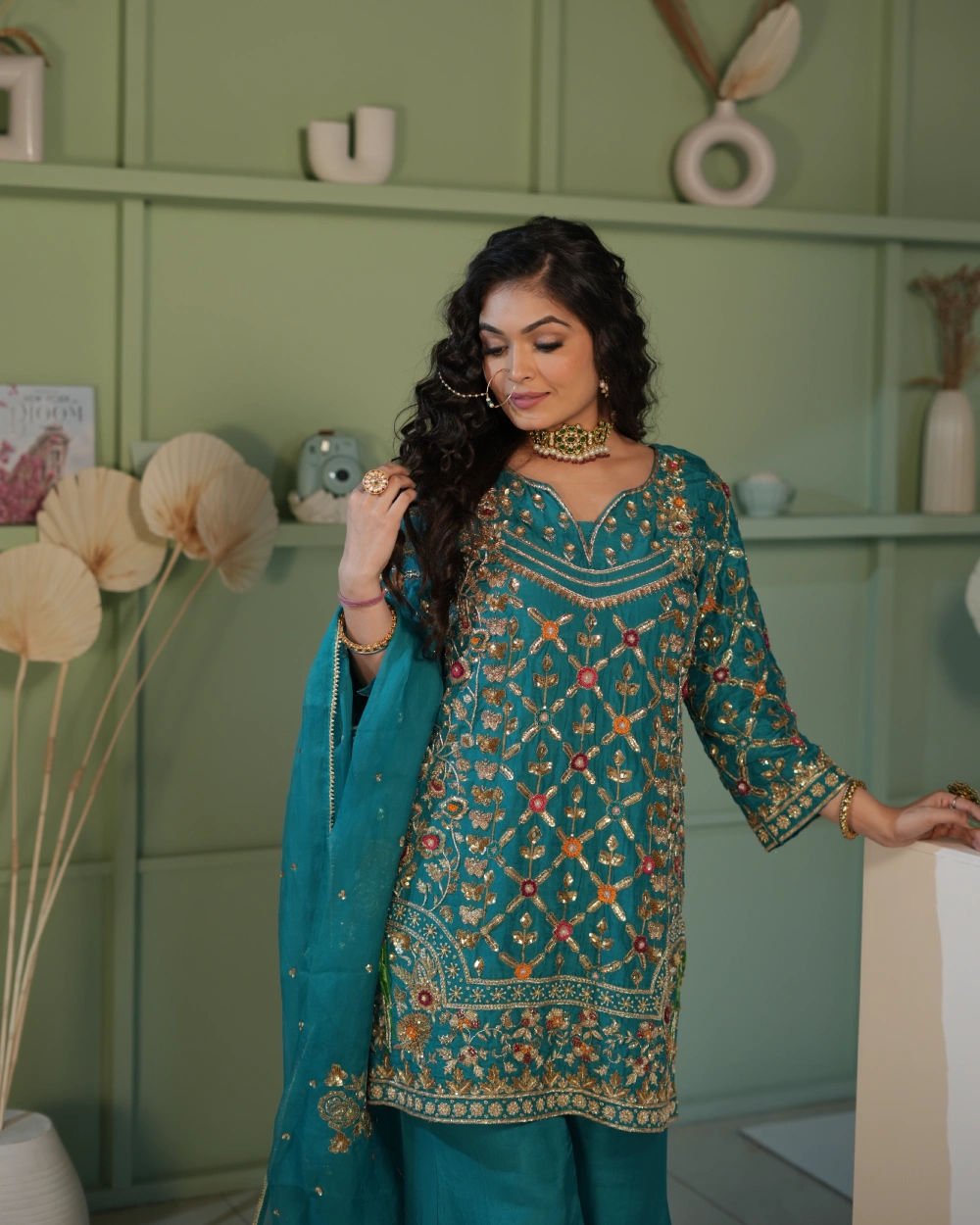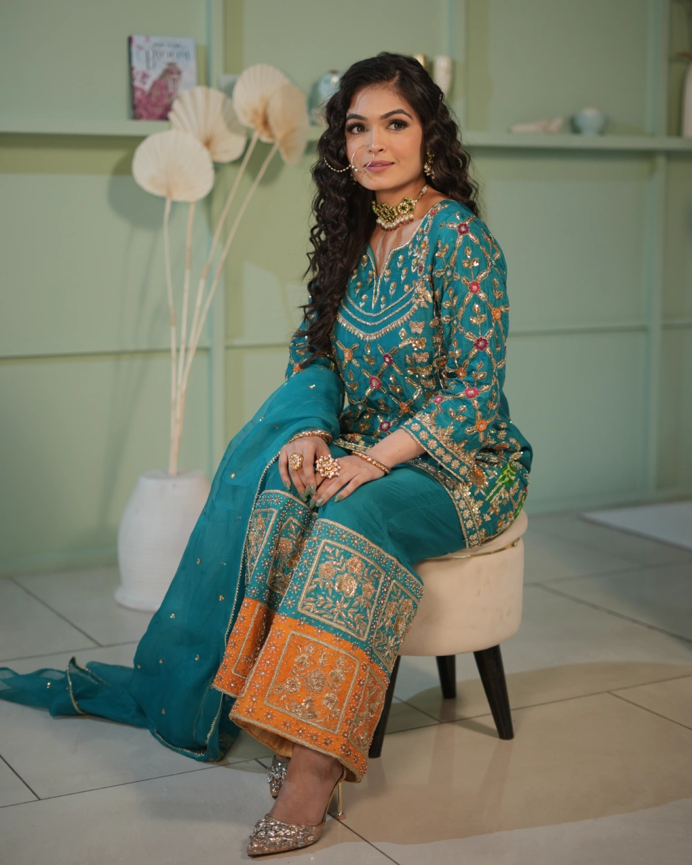 Our gray velvet suit is 4 piece outfit. The crape shirt with a kalidar pyjami and an organza dupatta is paired with pre velevt jacket. The jacket is so beautifully embroidered with cut-dana, pearls, dabka, sequin and resham.